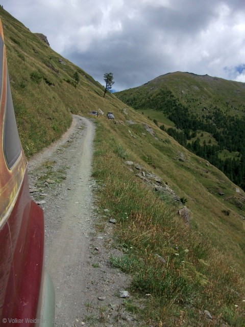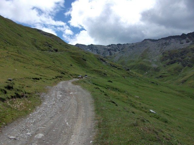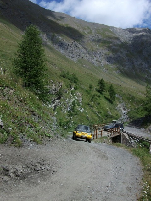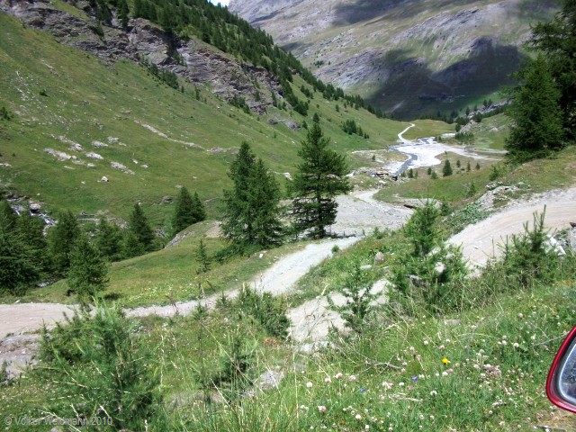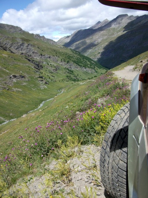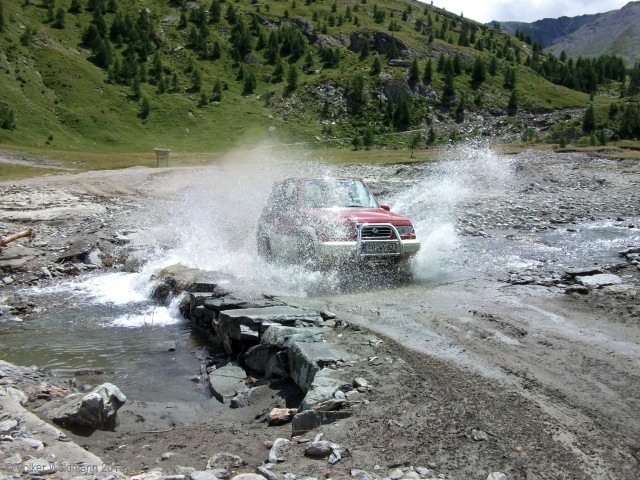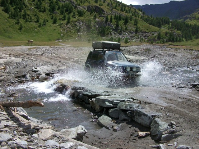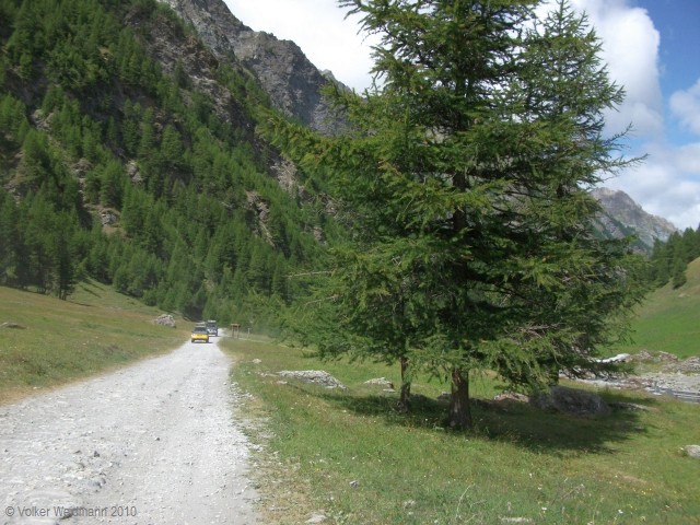 Mit nur noch vier Vitaras ging es wieder hinunter ins Tal und nach kurzer Irrfahrt fanden wir den Einstieg in das Valle Argentera (keine Kz. ;-)). Eine Schotterpiste zog sich immer am Laufe eines Flüsschens tief in ein liebliches Tal hinein. Die Wiesen und Auwälder scheinen bei den Einheimischen als Campplätze sehr beliebt zu sein, aber ohne daß sich aber das Gedränge und Chaos wie auf einem Campingplatz abzeichnete. Na gut, Duschen gab es hier sicherlich auch nicht…